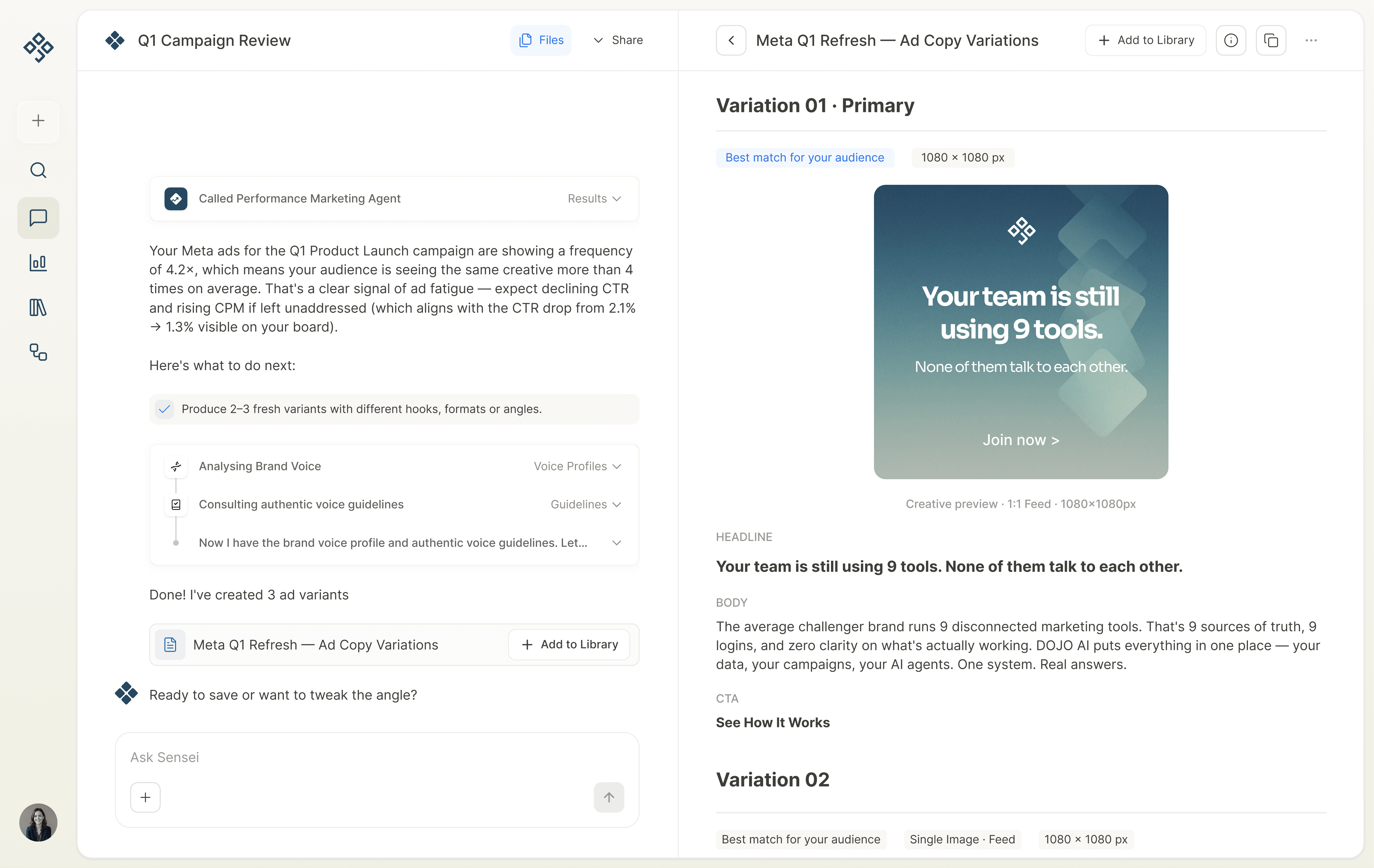 CPM is up 43%. CTR is dropping. Here's why, here's what's at stake, and here's what to do about it. DOJO surfaces what matters, ranks it by impact, and brainstorms with you a solution.